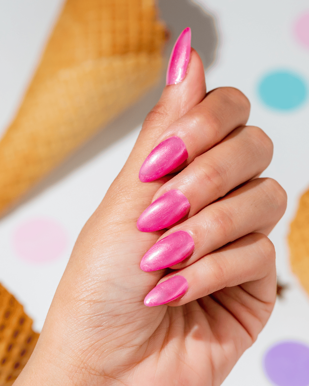 This lush pink polish is anything but basic - it glows from within with a radiant metallic sheen. Think guava sorbet meets glam, giving your nails a fresh, fruity glow-up.