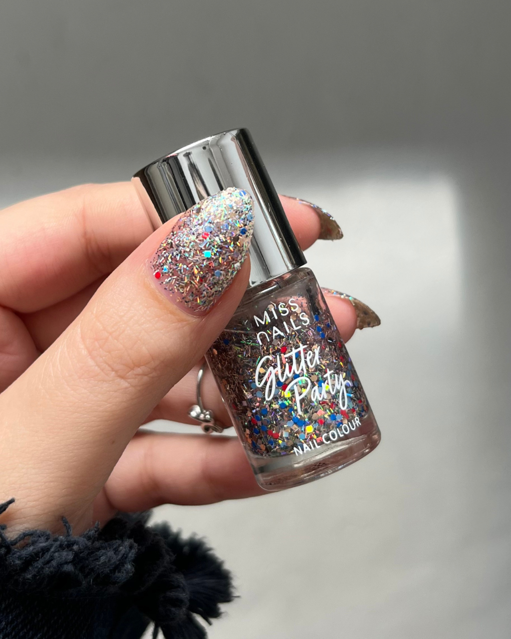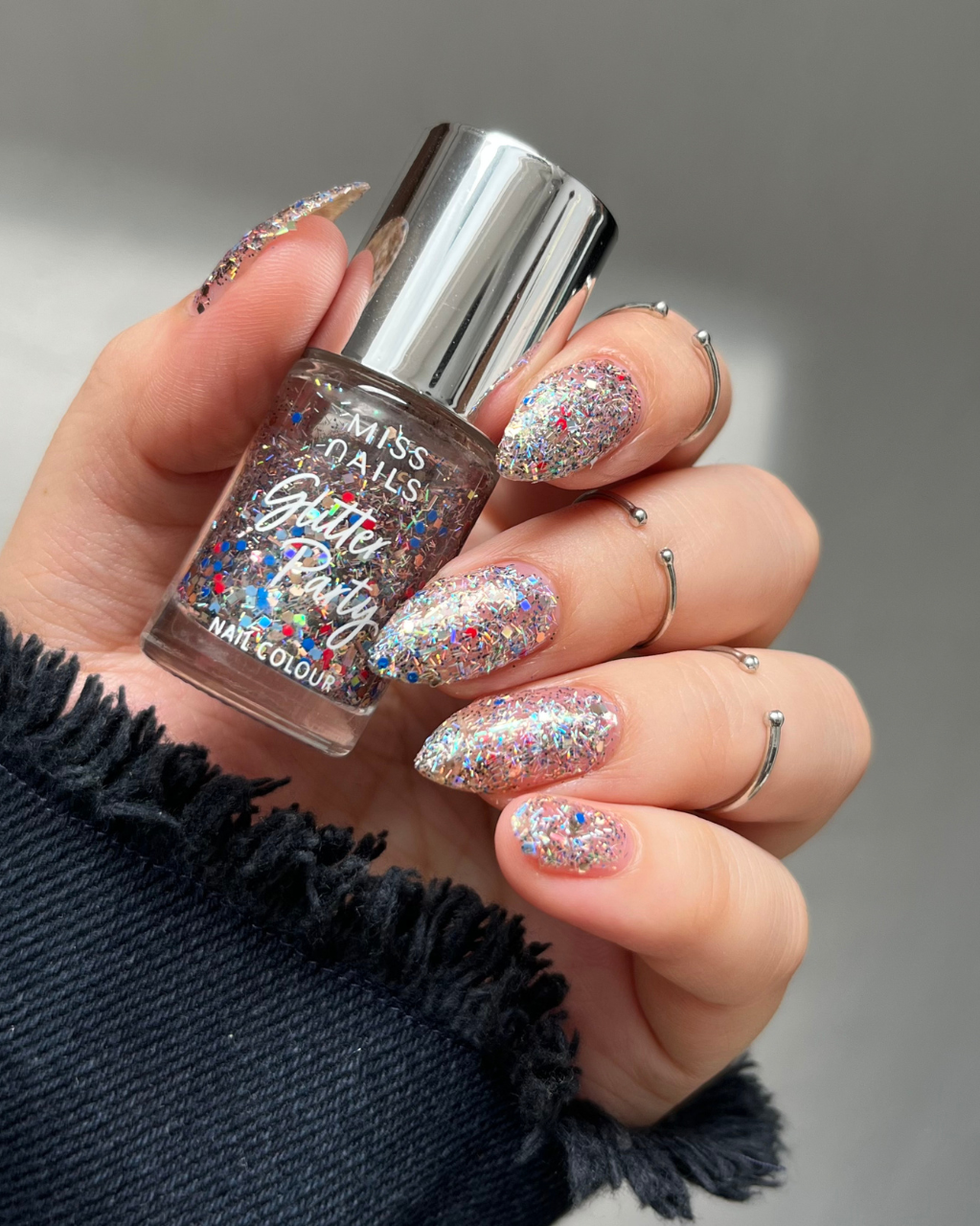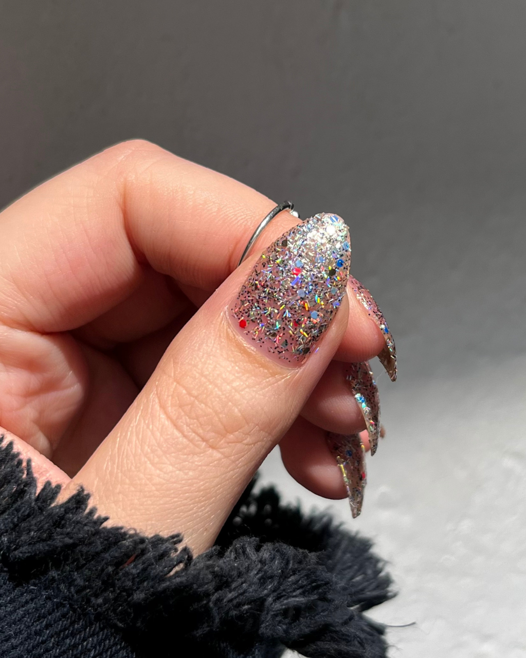 A playful, statement glitter packed with bar, hex, square, and mixed-size glitters in red, blue, and silver holographic, made to turn heads!